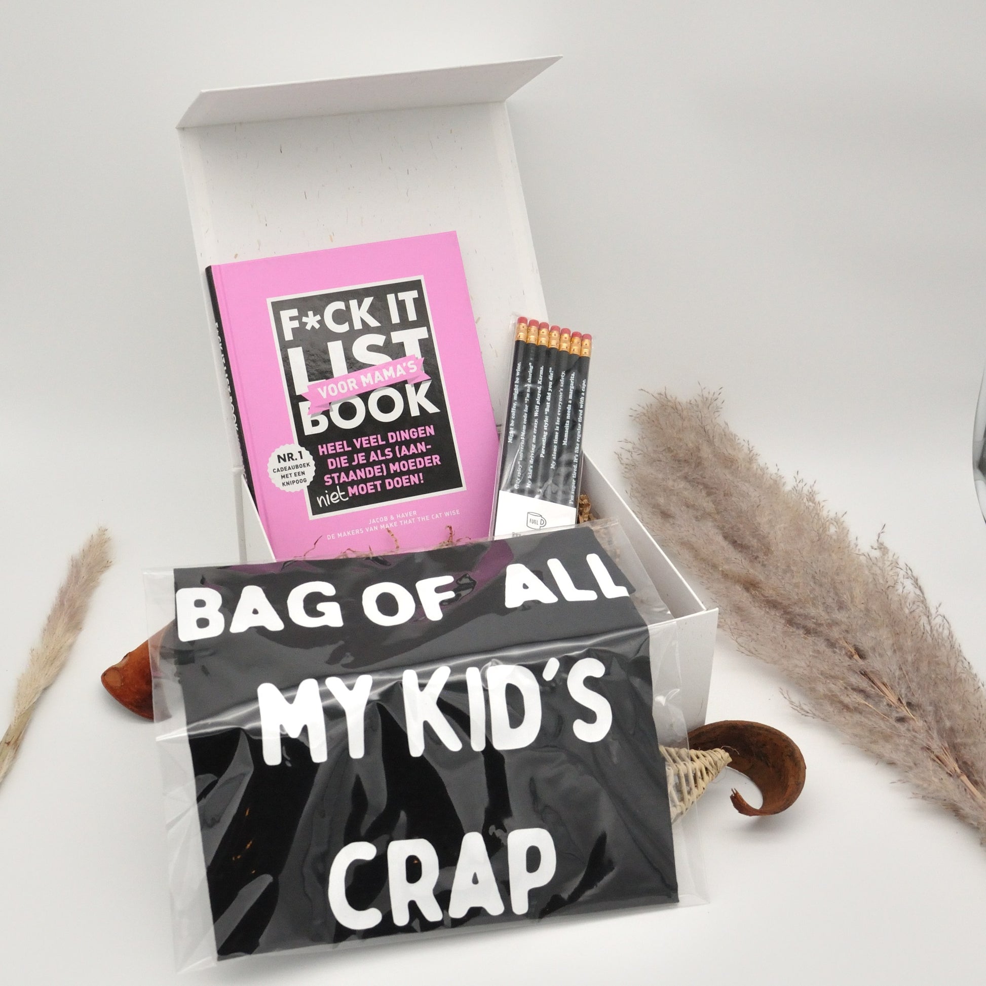 - F*CK it list boek voor mama's (Dutch): In this book, the authors humorously capture the (difficult) life of a mother, from pregnancy to raising a child. All from the F*ckit point of view, so that every mom gets a little more time for herself. Hardcover, 96 pages.