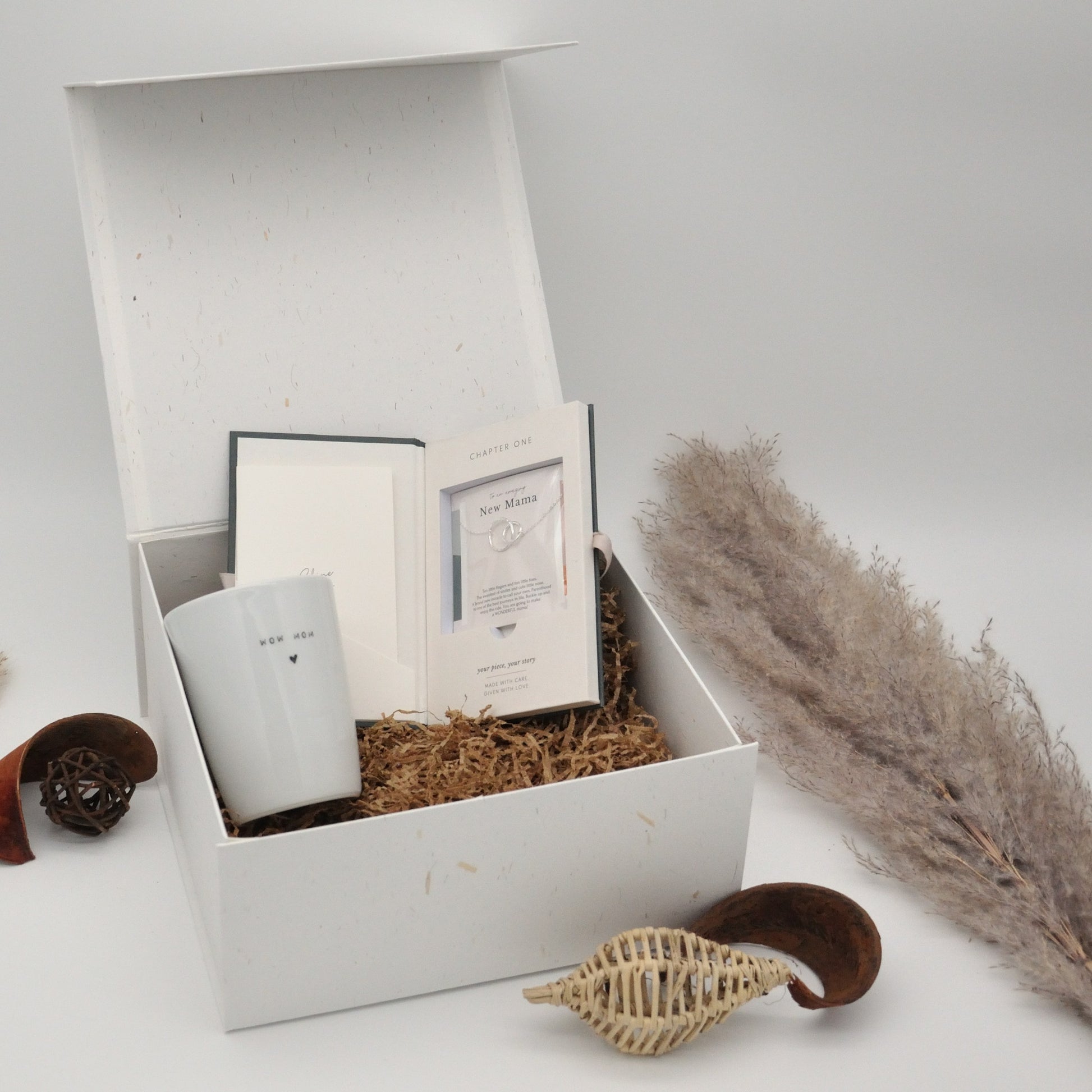 The gift box has a white finish with straw accents and a beige satin bow and contains products beautifully wrapped in white tissue paper with a floral pattern. The box, which measures 23 cm x 23 cm x 11 cm and has a magnetic closure, can be reused to keep baby memories.