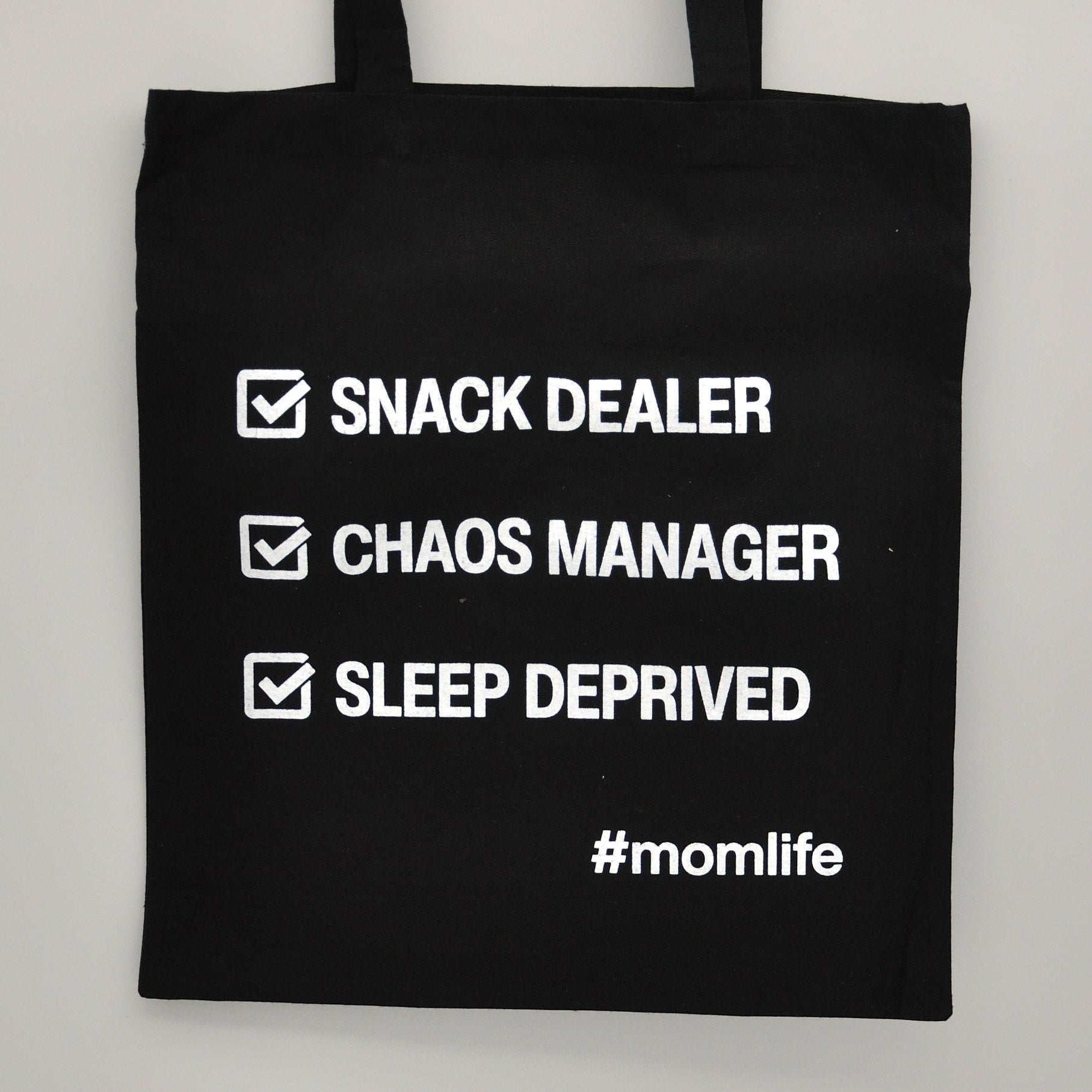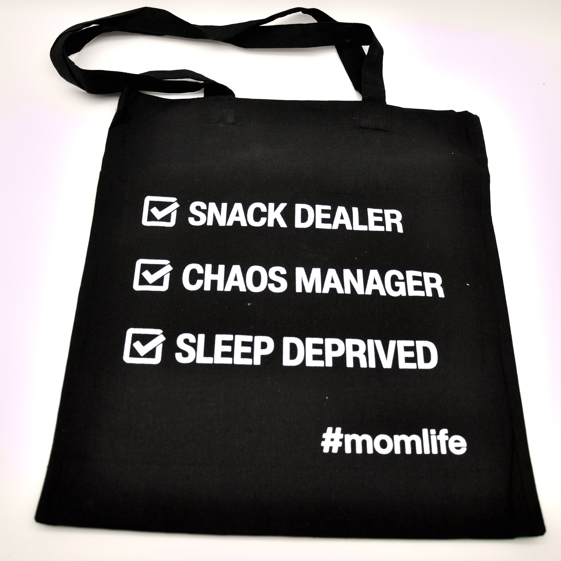 Zeg het met stijl én een knipoog! Onze zwarte katoenen draagtas is het perfecte accessoire voor elke drukbezette mama. Met de speelse print ‘Snack Dealer’, ‘Chaos Manager’, ‘Sleep Deprived’ en het herkenbare #momlife, laat je zien dat jij het moederschap met een flinke dosis humor en flair rockt.
